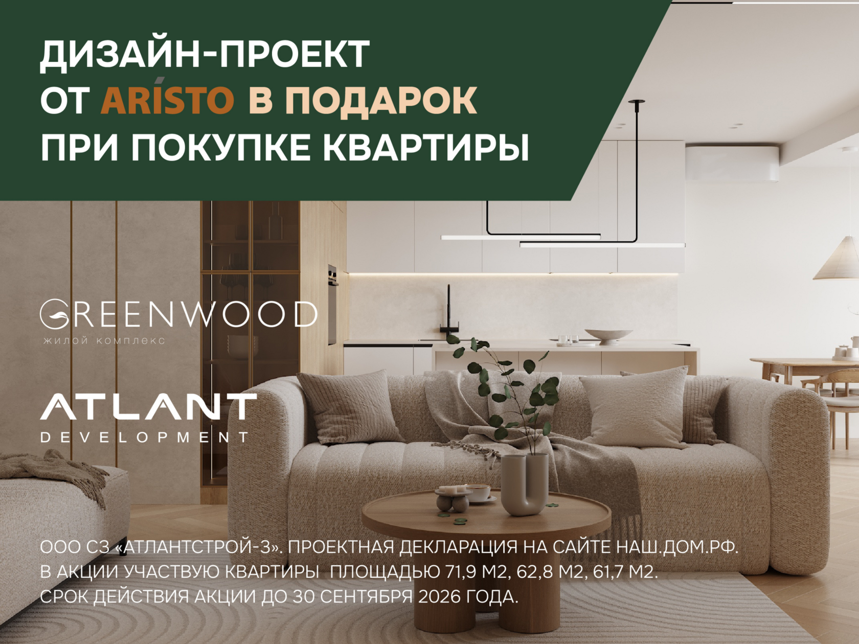 🎁 Оформите покупку квартиры площадью от 60 м² в жилом комплексе Greenwood и получите дизайн-проект интерьера от студии Aristo в подарок!