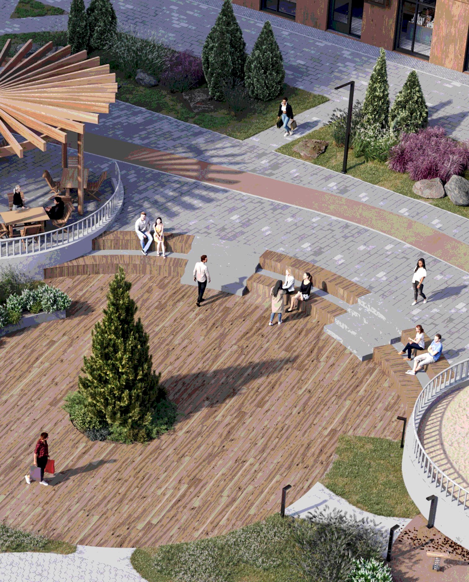 В центре двора амфитеатр — уголок уюта для прогулок, встреч с друзьями или чтения на свежем воздухе. Зеленое окружение и спокойная атмосфера дарят ощущение приватности и гармонии.